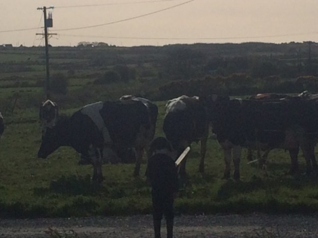 Eventually, when I stopped all the hopping and cursing and roaring for himself to come down,  or something along those lines, the cows, their bellies full, decided to obediently wonder up the right road on hearing their real master’s call.  And so, this busy mother ,  now qualified farmer, slowed down to take in the view, the sunset, the lovely spring evening, slipping her hand into her farmer’s hand for a tiny stolen moment.